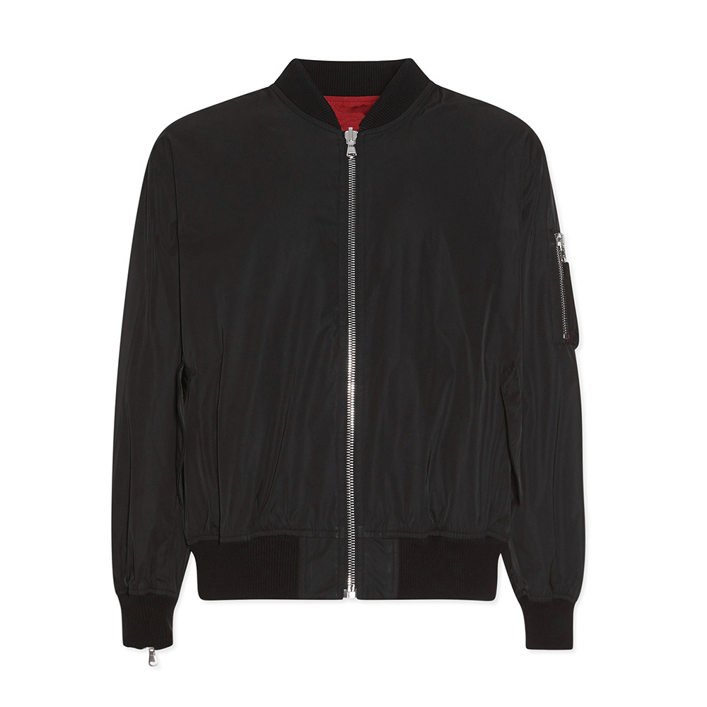 A bomber jacket is a short, waist-length jacket with a front zipper, ribbed cuffs, and a hem. Originally designed for military pilots, it is typically made from materials like nylon or leather and often features a fitted silhouette and functional pockets. Bomber jackets are popular for their versatile and stylish look in casual and streetwear fashion.
