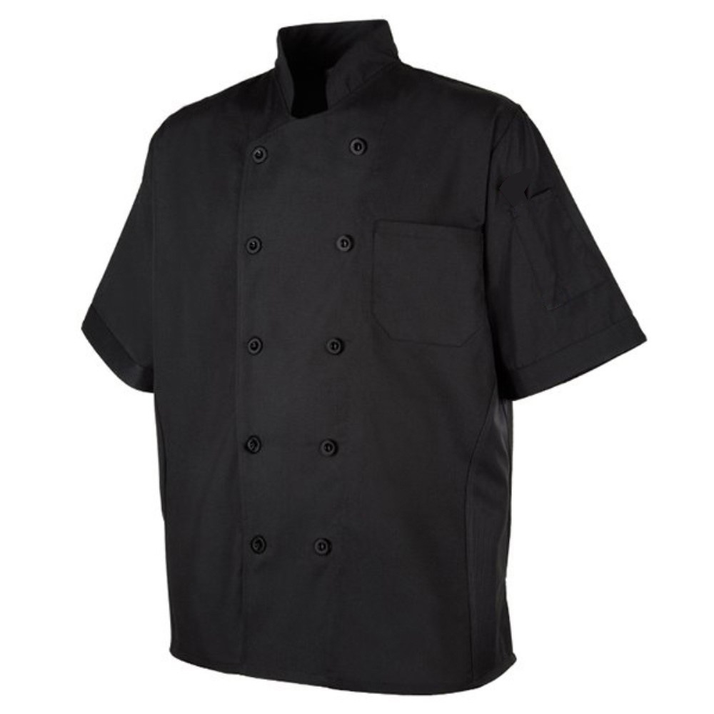 A chef coat is a double-breasted, long-sleeved jacket designed for chefs, offering protection and a professional appearance. It is typically made from thick, heat-resistant fabric and often features fold-back cuffs and knotted buttons.